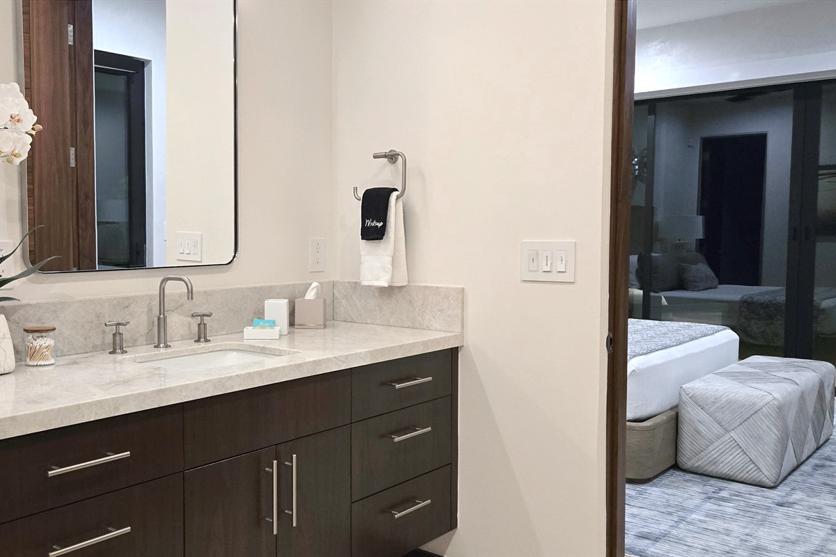 Oceanside, the home is an entertainer’s dream with a spacious covered lanai overlooking the infinity-edge pool and spa, comfortable Baja shelf recliners and cozy fire pit for unforgettable evenings under the stars.